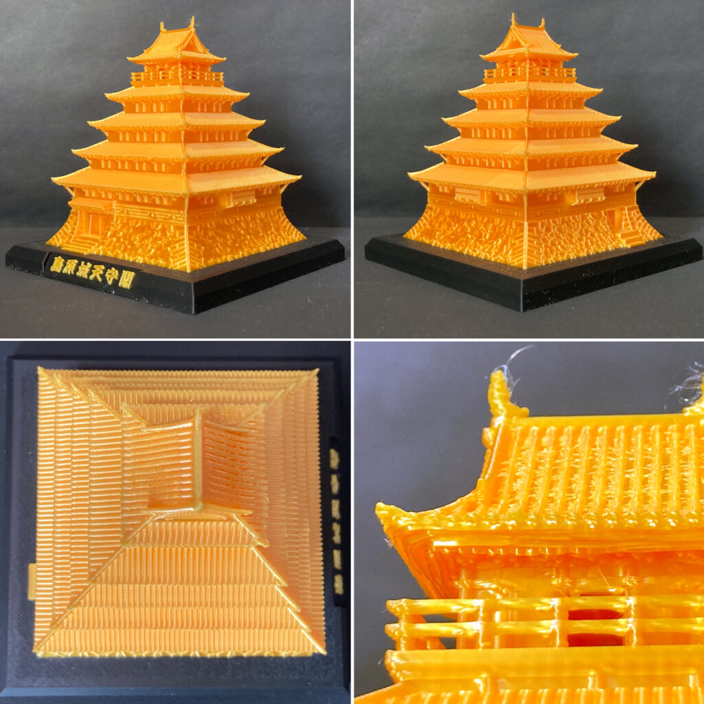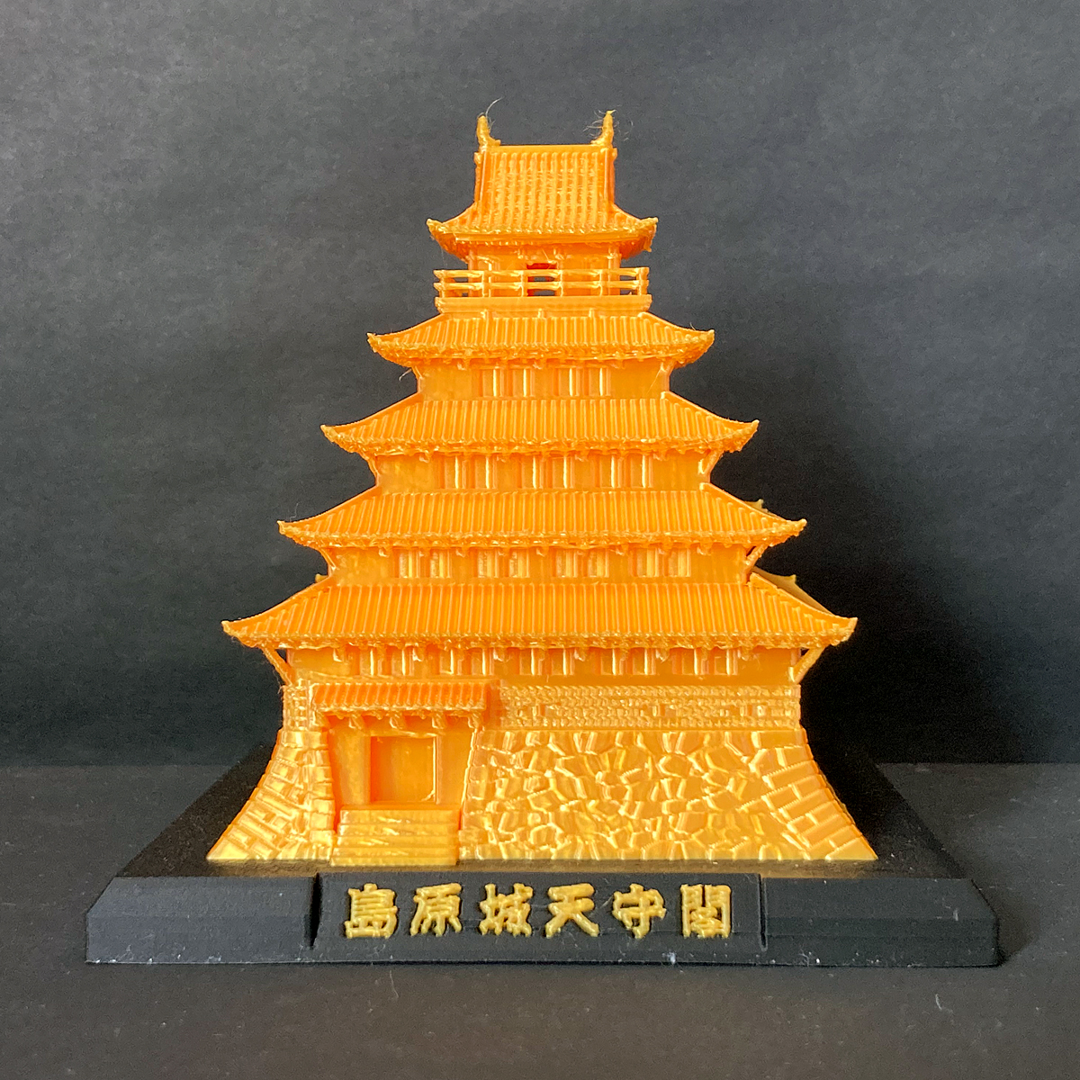 知人の依頼により、二色の島原城をプリントしました。フィラメント(シルクゴールド)が残り少なくなっていたので、サイズをひとまわり小さくして、高さ10センチ、積層0.12mmのプレミア品質で造形してみました。